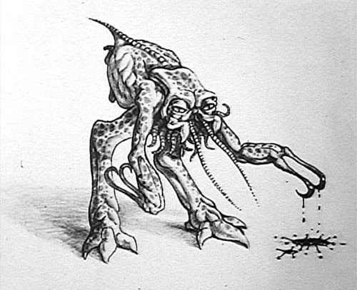 Building on the insect concept, this next unused Neomorph design depicted the spore spawn alien as having multiple posterior limbs, again like a spider. The head as well featured a very different look to what it eventually became.