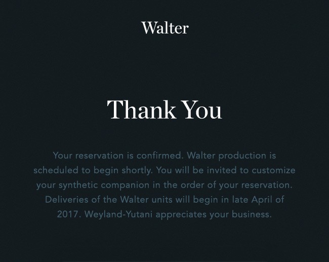 The video itself contains small disclaimer text, insinuating that Walter "imprints" on whoever he interviews with and / or serves. This prompts a "no refunds" statement by Weyland-Yutani, as it seems each Walter unit is capable of developing an alternate personality based on who they "imprint" on and associate with.