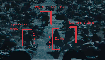 THE CATHEDRAL SET: This vast set consisted of a main room with GIANT stairs on the right hand side that led to an upper section. In the MAIN area we had HUGE ENGINEER head statues lined up one next to the other. The top half of their heads were missing (above ridge of the nose) as they will be completed in Post Production (VFX). The way I perceived it, these heads were representations of The Elder Engineers. In front of them rocky melons we had faux rock chairs and what came off as a stone made sacrificial table (with a dagger on it).
