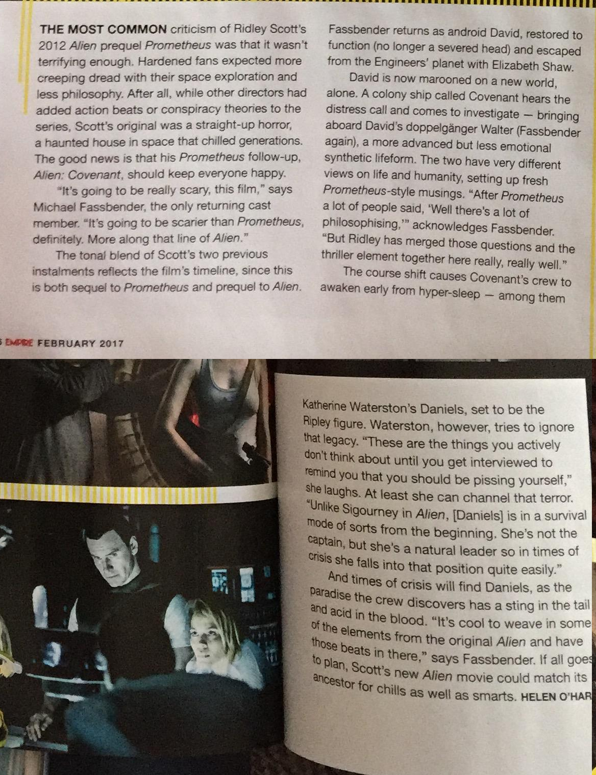 A batch of new Alien: Covenant movie stills have been featured in the February 2017 issue of Empire Magazine! Subscribers of the publication received an early look at the issue which will become available to the public at the end of this month. Inside is a page and a half dedicated to Alien: Covenant!