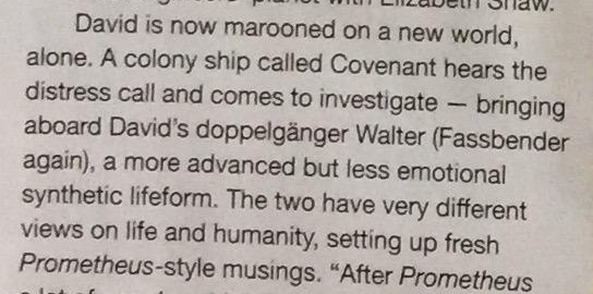 The stills include a photo of Ridley Scott and Katherine Waterston on set, a fresh look at Michael Fassbender's alternative Android Walter and another look at the Cryo-Pods which Fox teased a couple days ago. Here's a scan of the full spread: