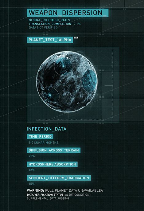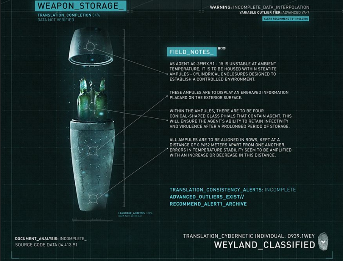 Again, how could Weyland know of the Black Goo and how could they have testing protocols having already run for the duration of the time required to produce the data above? The test planet definitely raises some questions. Everything used in the Prometheus marketing had meaning to it and many of it contained hidden clues and messages fans had to work hard to decode. This, I'm sure is no different.