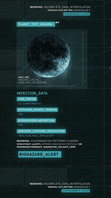 Could 1Alpha be Paradise? Time period of 1-2 lunar months (which is inconclusive, granted), total planet data unavailable? If this was a test by WY scientists why would they not have full data sets? It's interesting to note the time elapsed and % the infection has spread on the two sets of terrain and how this correlates to sentient life being eradicated . . . Could Paradise n fact be 3Gamma?