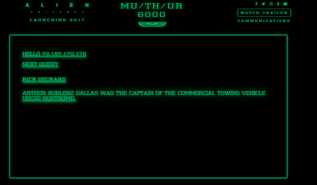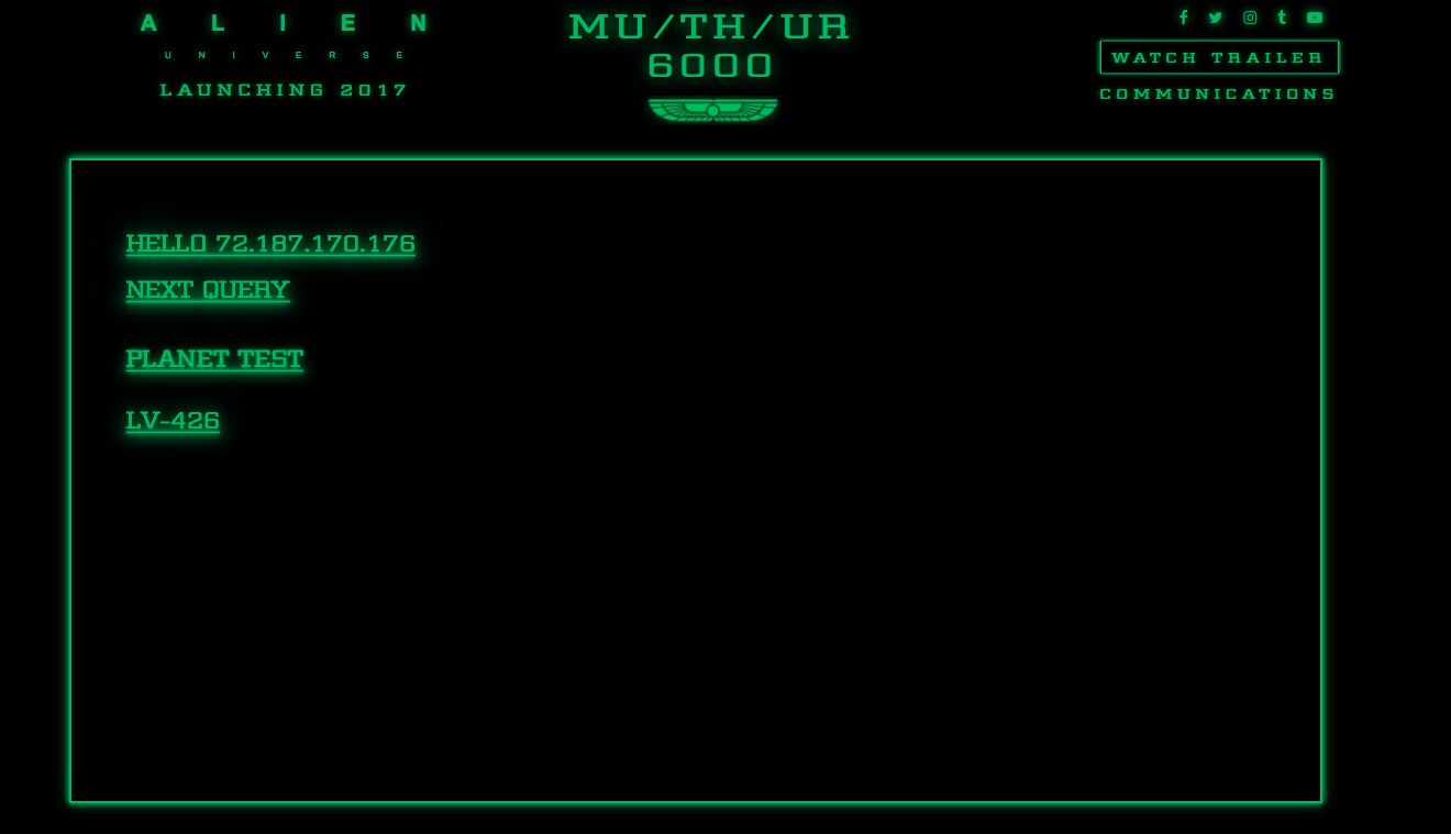 Lastly, I typed in "cosmic call 2", which I lifted from the Mission Database page on the Weyland industries viral website. It gave me the number 130748. How mysterious!