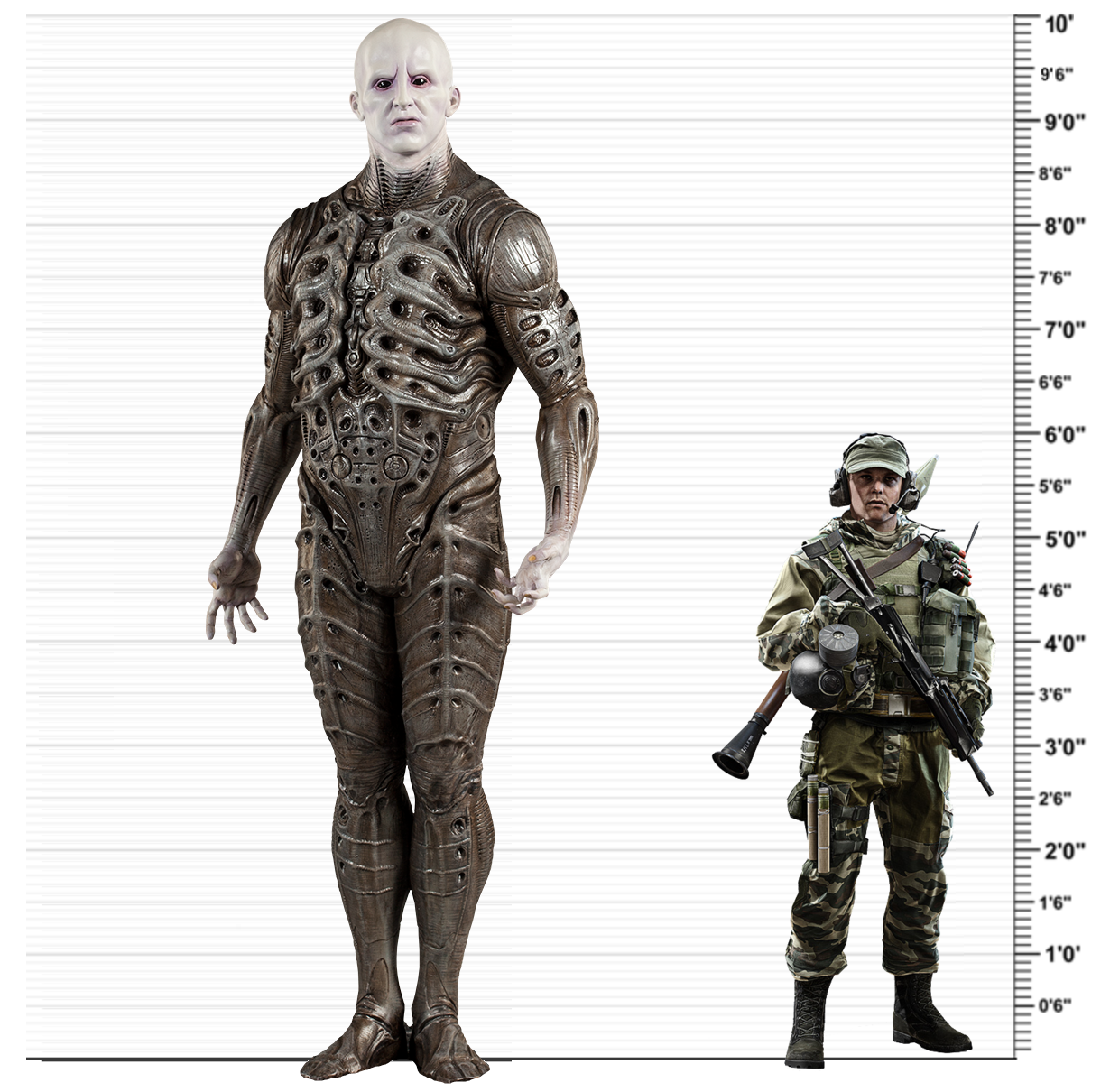 9-10ft is plenty and the engineer in Prometheus looked big enough to handle himself against most things. in the book alien river of pain, its even depicted an engineer going at it with a queen. maybe a step too far but an engineer-xeno one on one would be interesting. from what ridley says the engineers r nasty aggressive so I don't think the xeno would have it all its own way in that fight