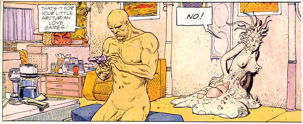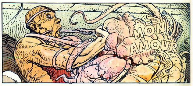 Perhaps also a little nod to the 'love' scene from the Dan O'Bannon-Moebius illustrated The Long Tomorrow......