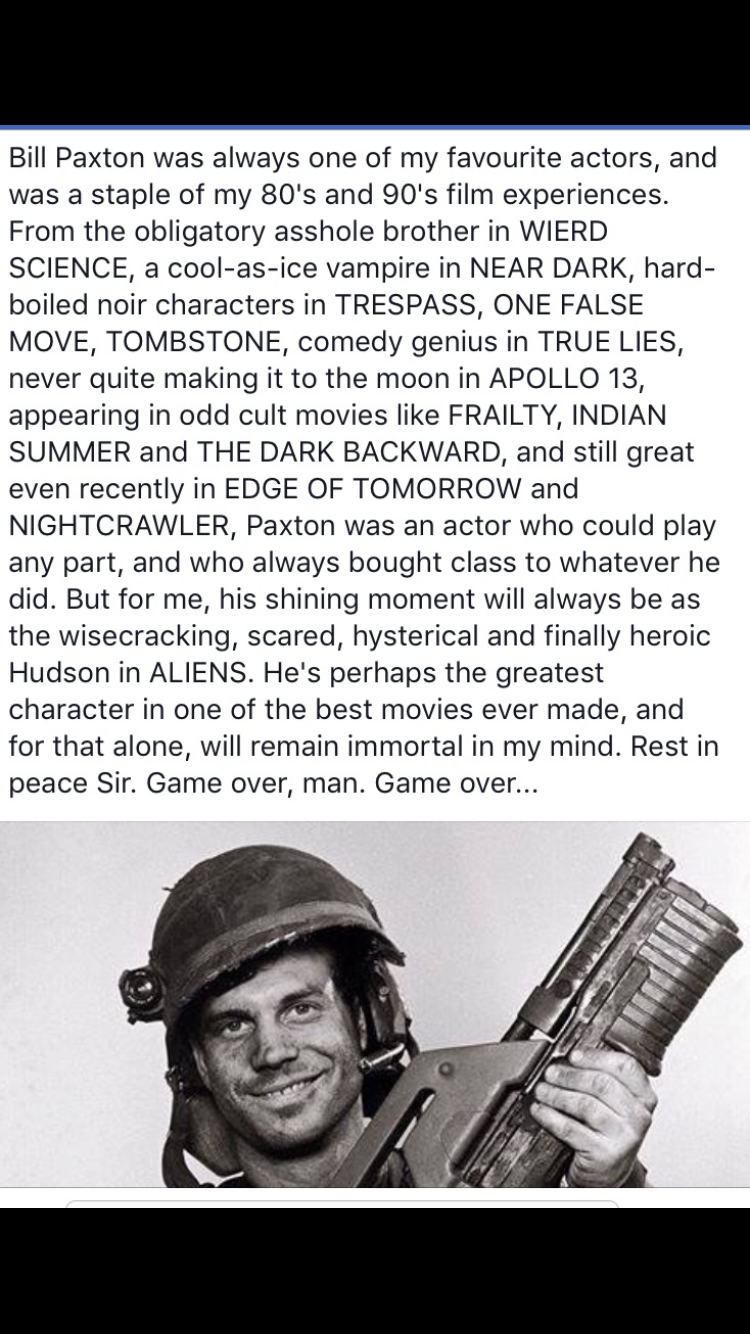 I'm going to give you guys all a little story on what Bill Paxton means to me.When i was growing up,Aliens was a very central part of my youth.The Alien series,along with Star Trek and Star Wars,has been one of the few constants in my life.My tastes change all the time,somethings i was once into I'm not anymore.Characters like Private William Hudson have a lot to do with that.When i was younger,my brother and I used to pretend we were Hicks and Hudson,my brother being Hudson.Because of that,I've had an almost brotherly association with Bill Paxton.I never met the man and sadly never will,but he has left me with many strong memories of my childhood.Aliens is after all my #1 favorite movie,and it has a lot with its cast of characters like Hudson.So here's to you Bill,with out my childhood wouldn't have been the same.Without you,I wouldn't be same.Rest in peace my dear friend.