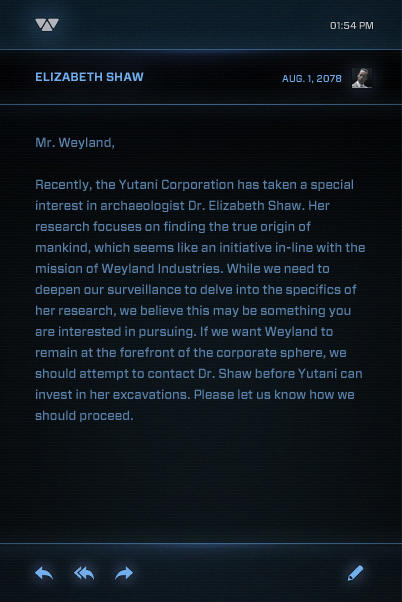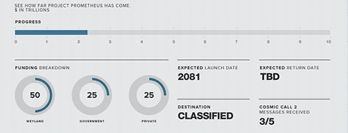 Weyland astronomers were searching space for signatures of precious metals when they made the discovery of Acheron LV-426 in 2039. The classified destination project of Prometheus was a Weyland Corporation, Government, and Private investment vehicle.