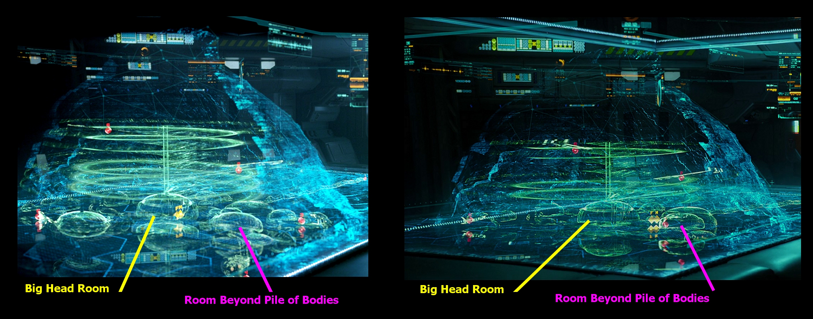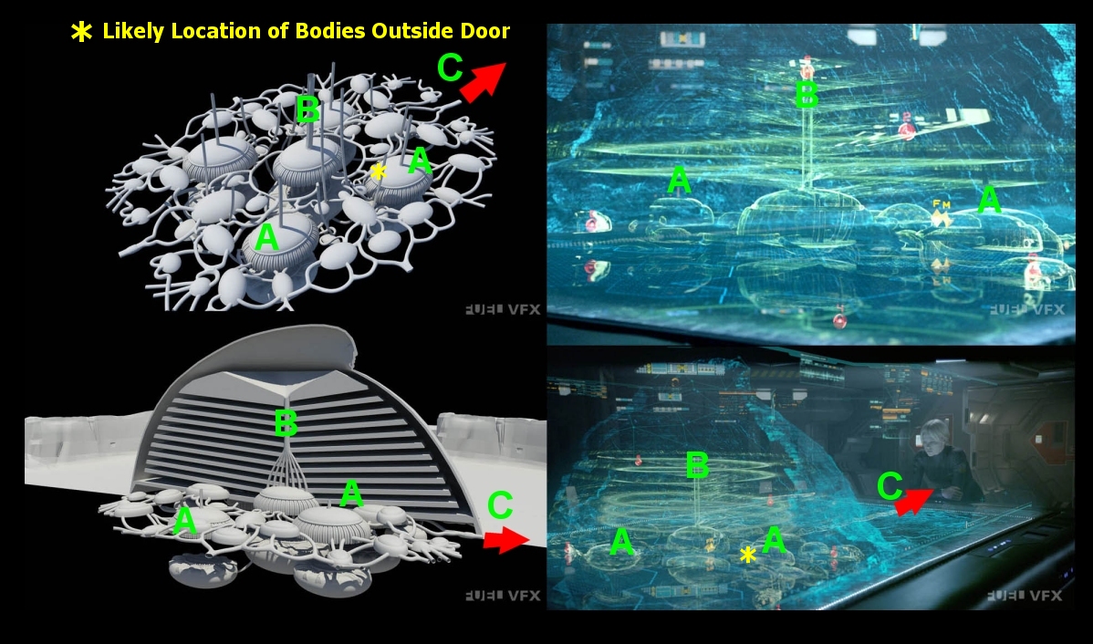3) Why the heck would 20+ Engineers end up in a dead end and then all chest burst, but fall in a neat pile? They would at least writhe in pain, fight, partially run away, etc. They were piled there by their attackers.