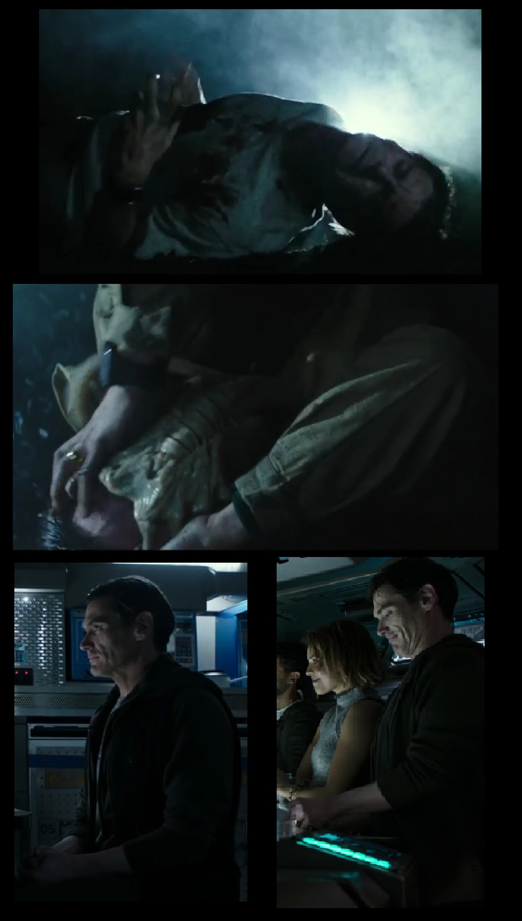 The guy in that picture looks like his hair is too long to be Fassbender to me. I actually have no idea who he is, Crudup's stunt double? He's the only one for sure we know right now who gets facehugged. Somebody else entirely? And I actually don't think David experiments on Shaw at all.