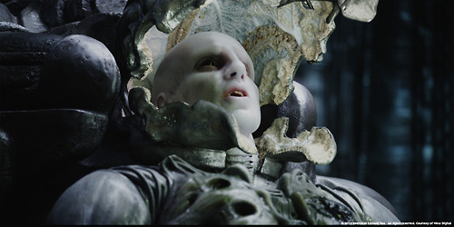 The pictures posted by Ingeniero seem to show a space jockey helmet encapsulating Shaw's head, very similar to the scene in Prometheus where the engineer activates the helmet. You can see the mandibles and the top plates. They move inwards with each frame, the snout seems to be forming and the black eye covers are visible. The eye covers also move forward, as if moving into place, with each frame. The entire recording could also splice together a series of small recordings, which wouldn't be clear in the trailer. This much discussion is mission accomplished for Fox and Scott, either way.