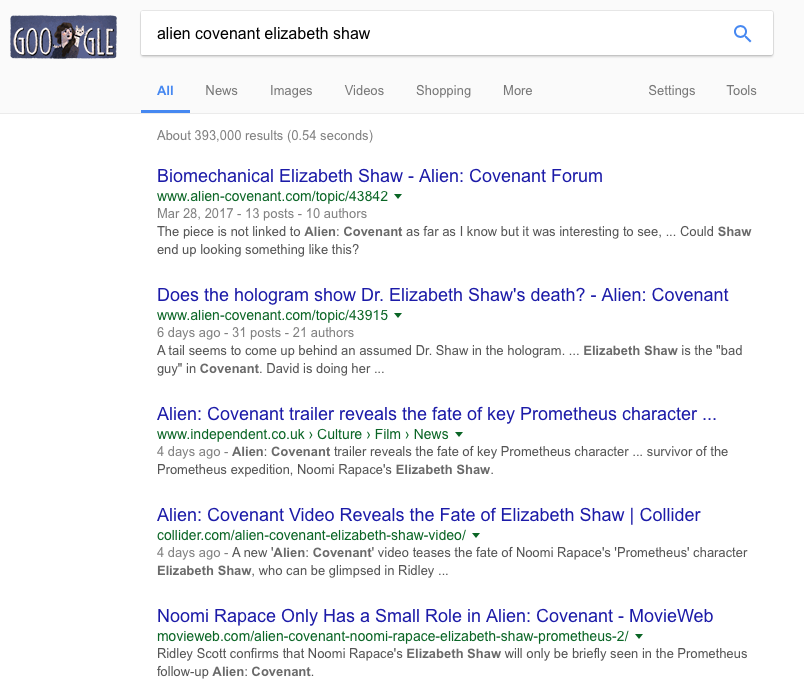 When you search Alien: Covenant and include a formal name like Dr. Elizabeth Shaw and David 8, this forum and my topics come up in the Google search results.