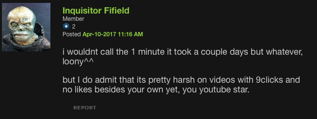 "but I do admit that its pretty harsh on videos with 9clicks and no likes besides your own yet, you youtube star."