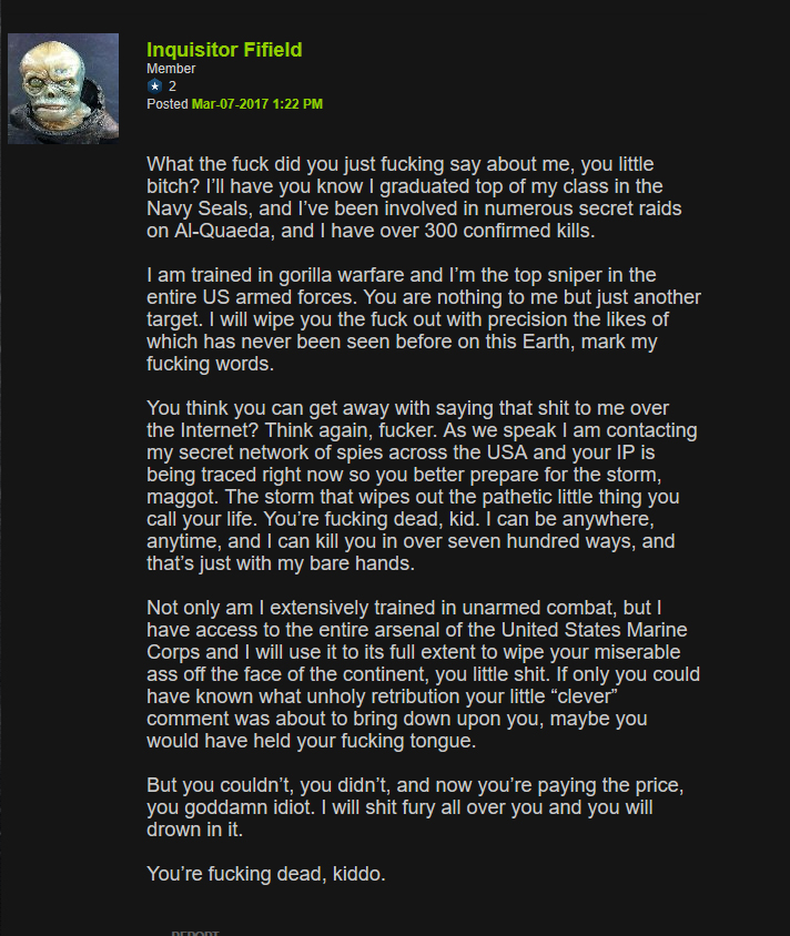 That rage comment quote from 4chan or some other anonymous board is just legendary and older than the internet itself.