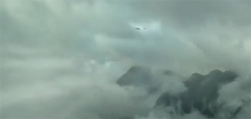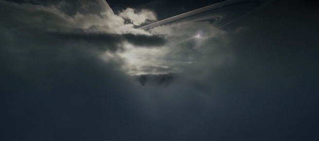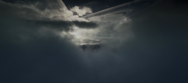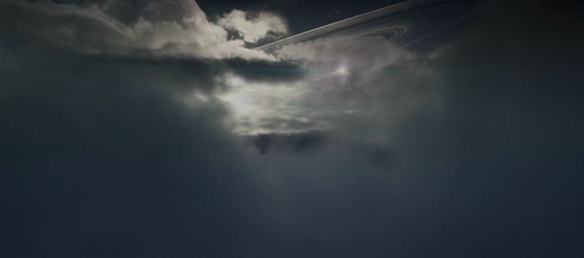 The juggernaut appears above breaking through the clouds on a planet (Paradise?). Preceding this image was a white flash in the cloud cover (below).