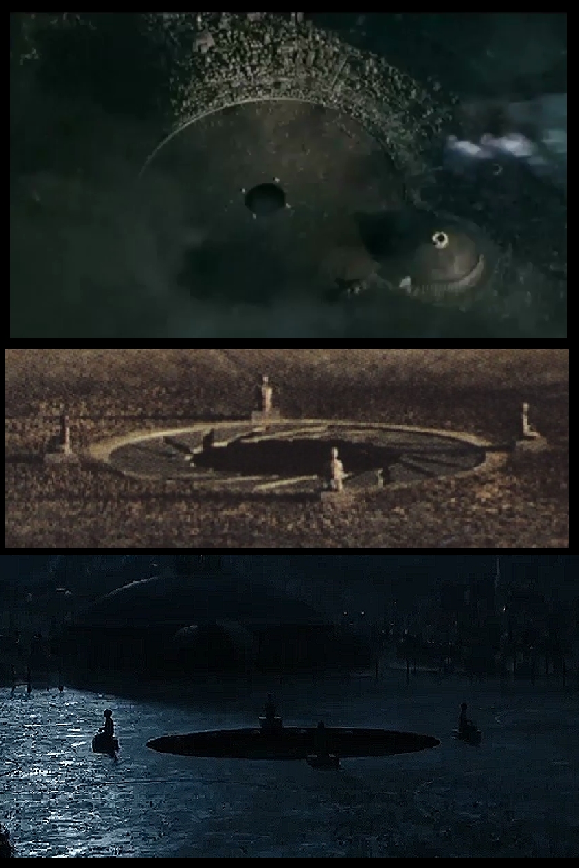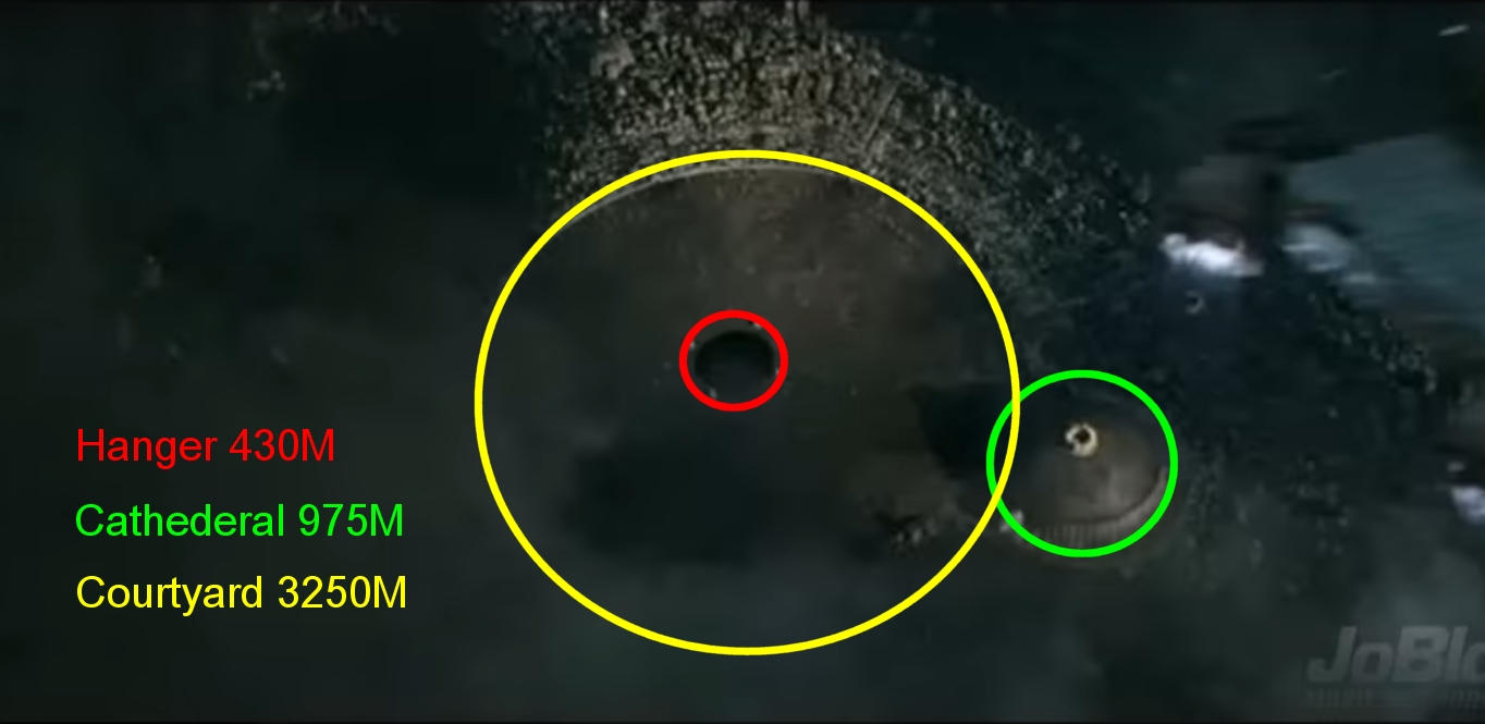 The Hanger seems to be right in the Center of the Courtyard and some distance from the City and its monuments and the Cathedral.  So the Hanger is some Central Part of this Culture that looks a bit Ancient, the main Technology we can see is the Hanger, the Scorpion Ship and the Gold Device on the top of the Cathedral Dome.