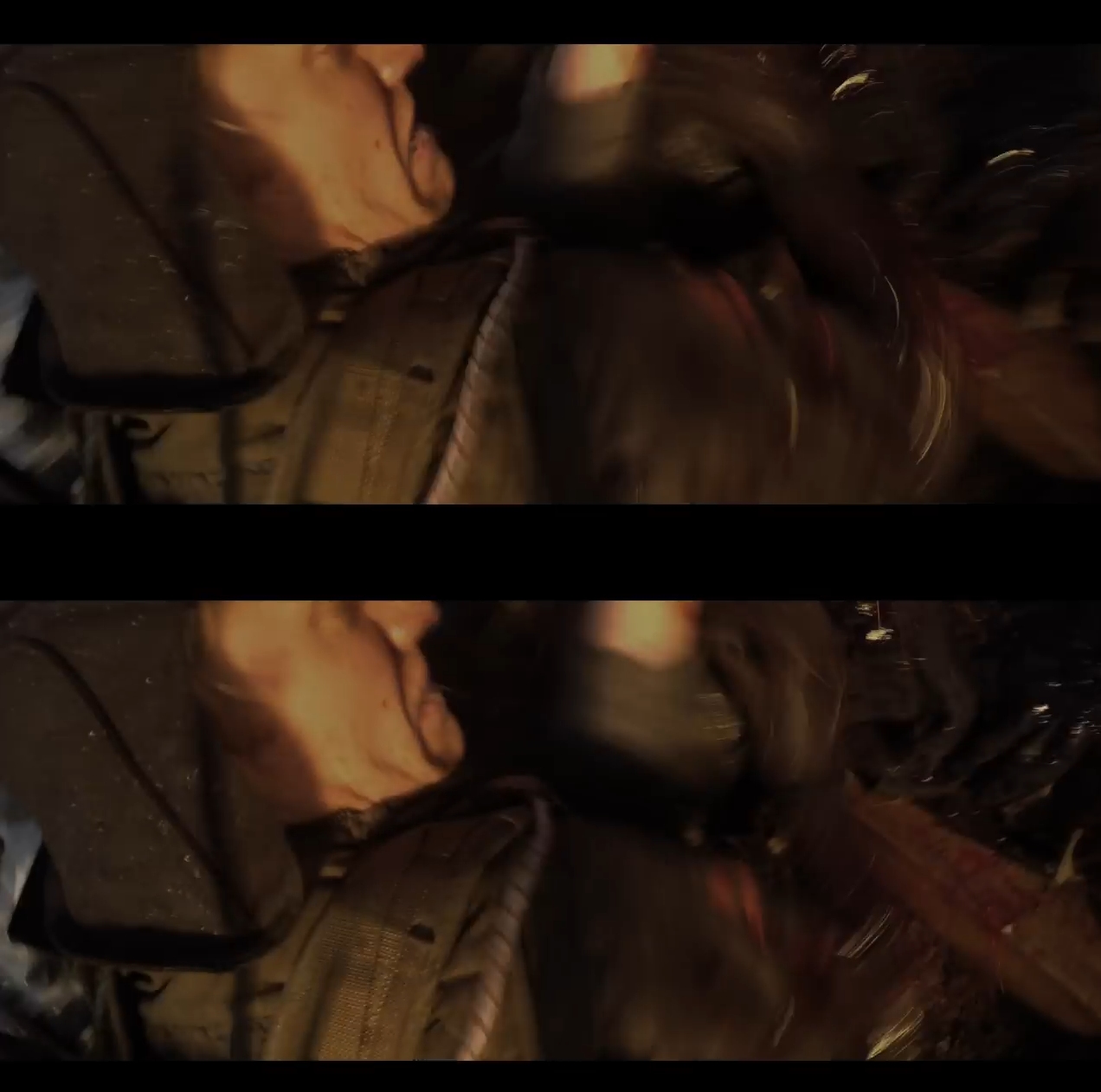 It shows Alexander England's Character either has a Wound or is kneeling over someone else with a Wound this shot seems to be perhaps from the Neomorph Attack Scene from the Grasslands.