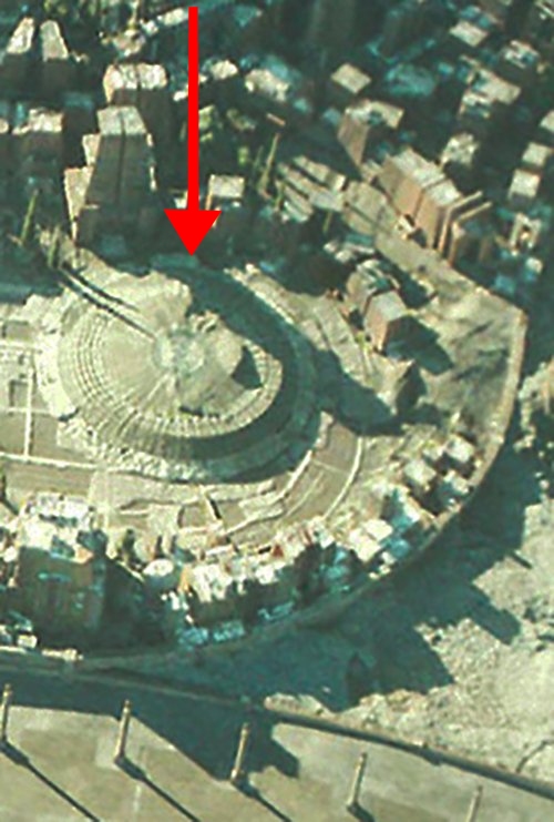 I am not sure it is in ruins. Maybe that is due to pixilation? Zooming in on Google map buildings has the same effect.