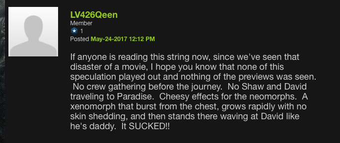 If anyone is reading this string now, since we've seen that disaster of a movie, I hope you know that none of this speculation played out and nothing of the previews was seen. No crew gathering before the journey. No Shaw and David traveling to Paradise. Cheesy effects for the neomorphs. A xenomorph that burst from the chest, grows rapidly with no skin shedding, and then stands there waving at David like he's daddy. It SUCKED!!