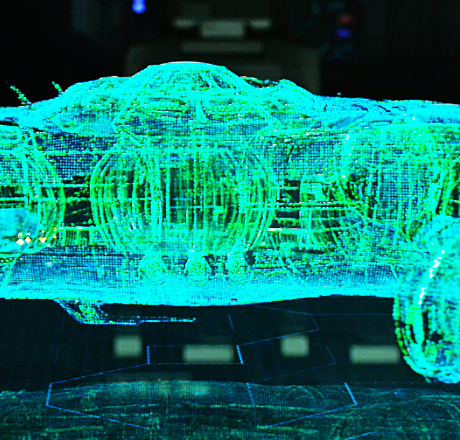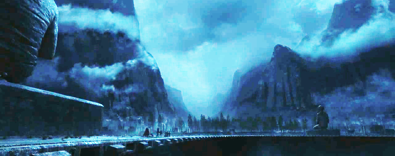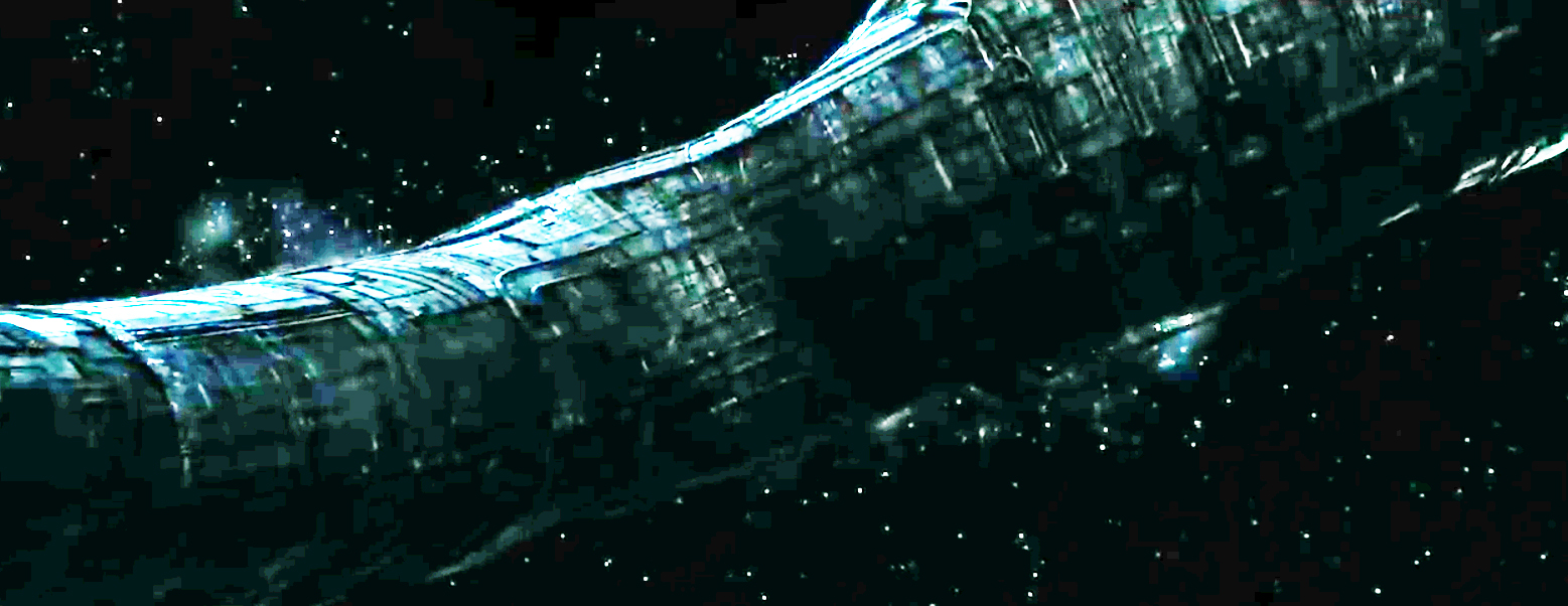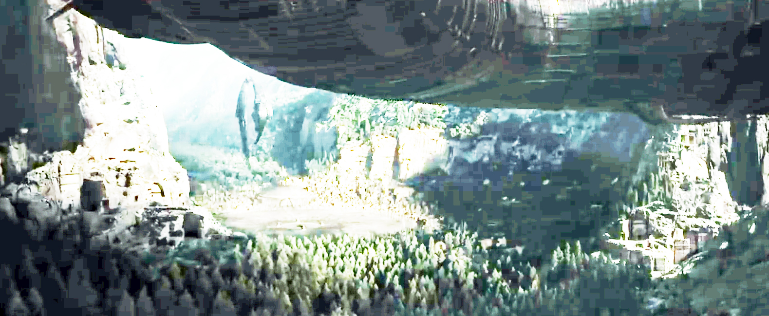 There isn't much detail to observe on the outside of the juggernaut in space and flying into the valley.