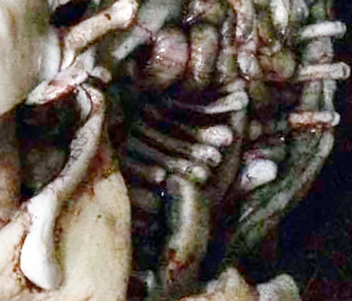It actually looks like whatever caused the metamorphosis made her burst from the inside and start producing eggs. The bones holding back the skin appear to be growing into it.and the ribs appear to have grown outward. They don't look broken or cut. That's creepy AF.