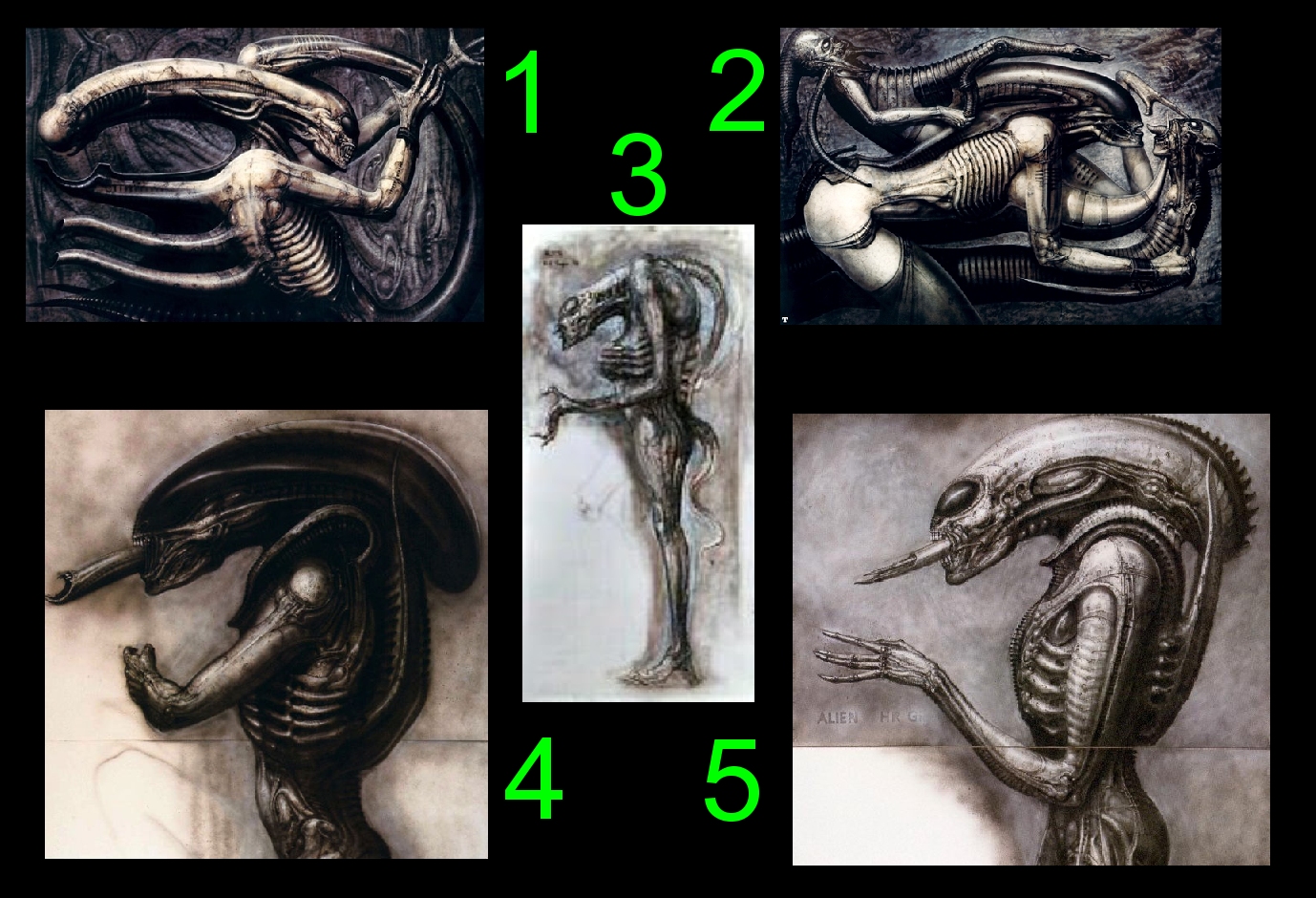 Image 3 was his first Alien Concept... Before he then came up with number 5 and then number 4 .... before he then finally came up with something that became the 1979 Xenomorph