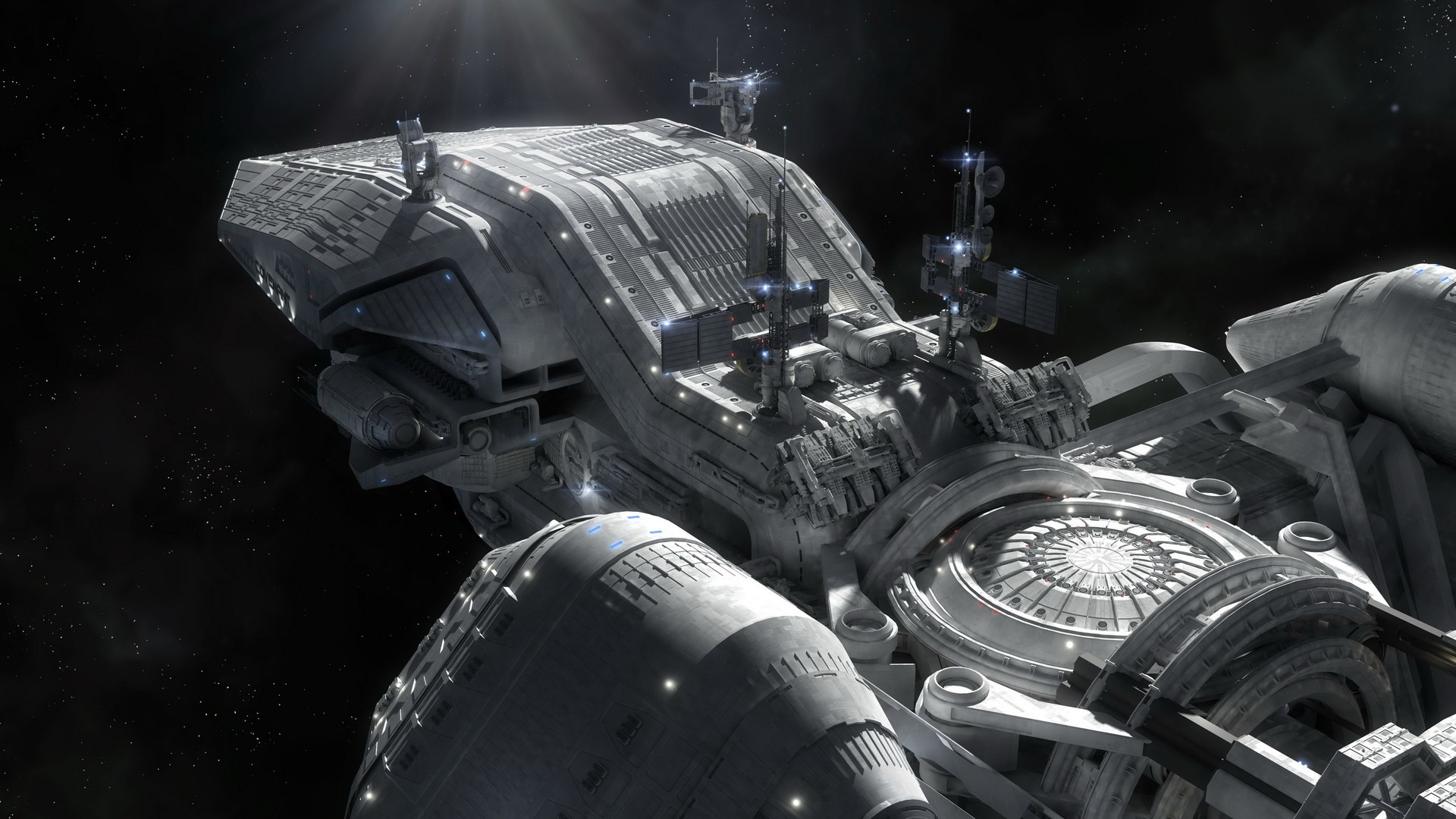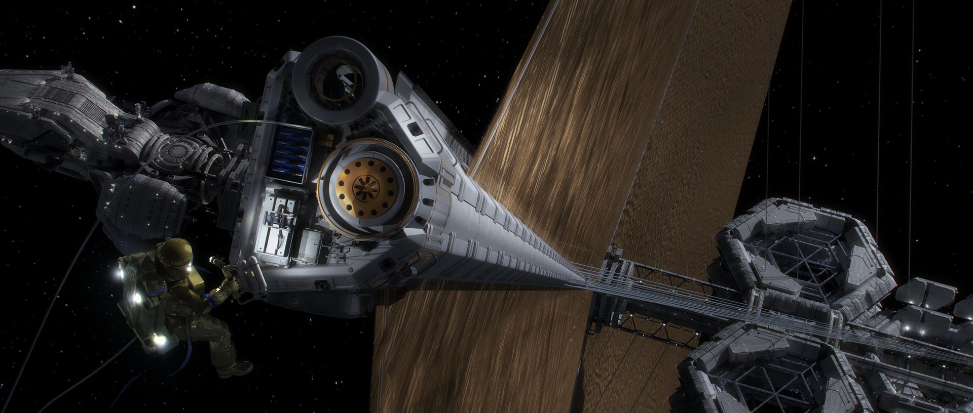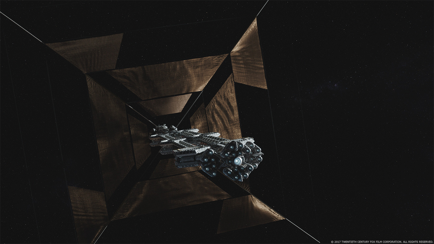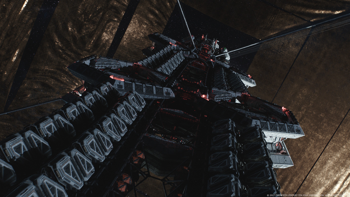 ’Development of the main ship continued into early post-production, with a detail pass focusing on the nose section and folding masts. Elements created by the art department for the EVA sequence were integrated into the overall ship, and the area around the bridge underwent considerable refinement. From there, the ship was handed off to the amazing visual effects artists at MPC and Framestore.’