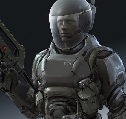 ’In one version of the script old man Weyland had some serious heavies accompanying him in secret cryostasis. Costume study. Yes, that's a compact version of the Aliens pulse rifle. Yes, his uniform says Batty.’