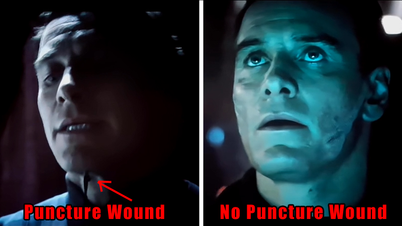 "David has a puncture wound.  Walter does not.  The right picture show the android back on the Covenant after they leave the planet."