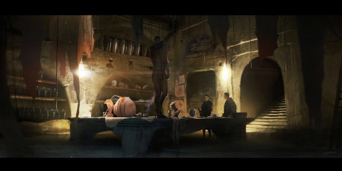 Wayne and Steven both did some Concept work on the Cathedral and both it looked the same apart from Slight Differences regarding the Human looking Figures on the Doorway/Entry to the Temple.