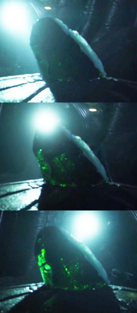 What is the deal with the half-exposed oblong emerald object in the ampule room that appears to have something inside it? While the shape is similar to the vase-like container that David removes, you’ll also note it’s larger, greener and more ovoid than the vase, closer to that of an egg. What is its connection and why is it placed ceremoniously in front of the alien mural and embedded in the stone altar?