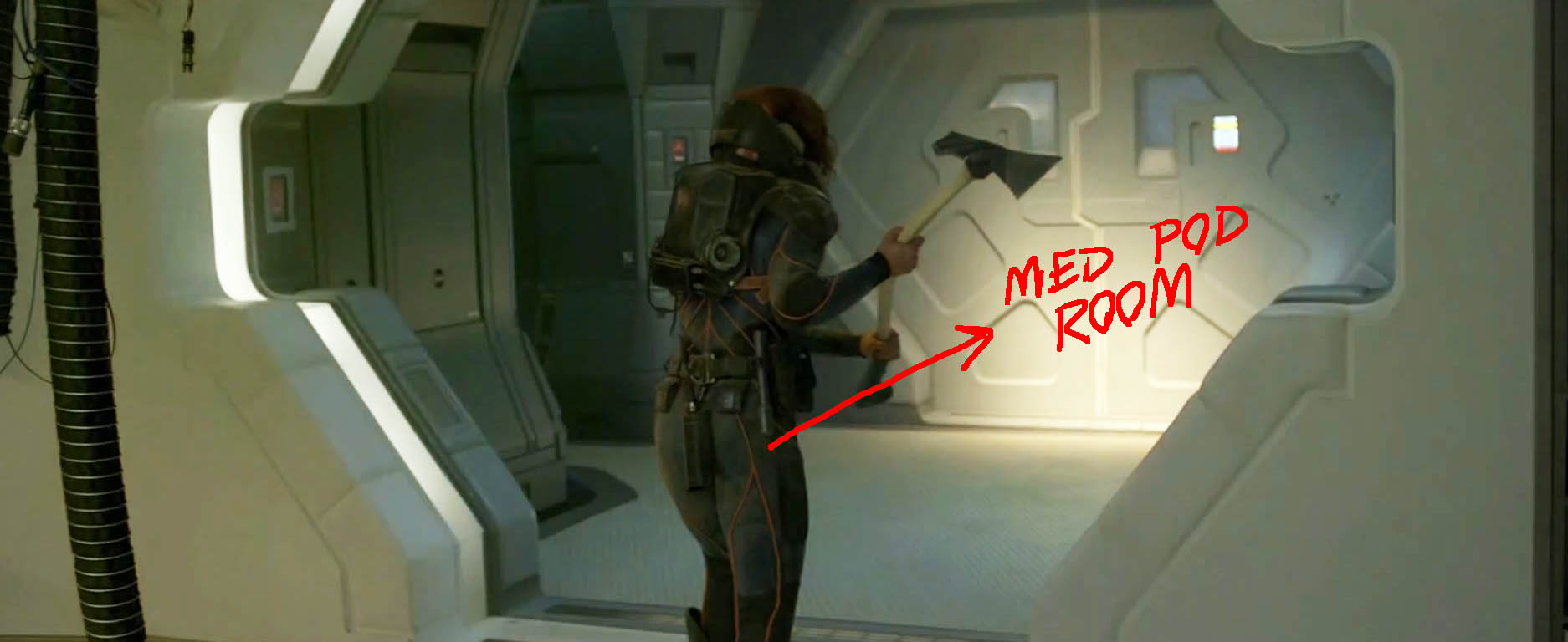 Also the distance between the inner door and outer door is a god 10ft or more.. maybe 15ft?  i think its between 10-15ft foot and then with the outer door closed she would have no place to stand maybe to see clearly from the first Airlock to the Vickers Suite not as clear line of sight to be able to see the area where the Med-Pod is.
