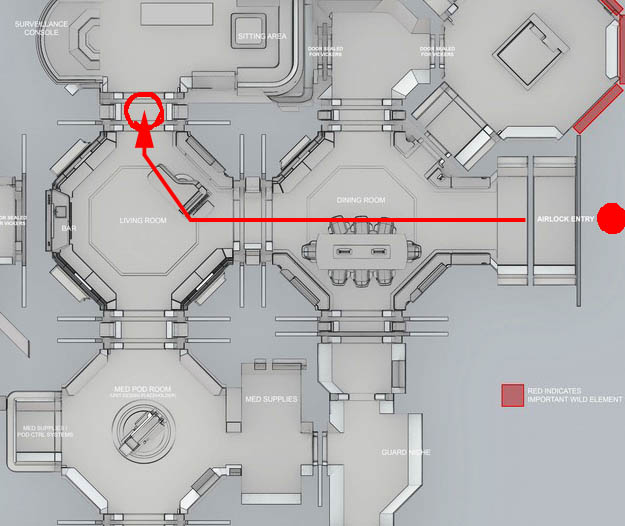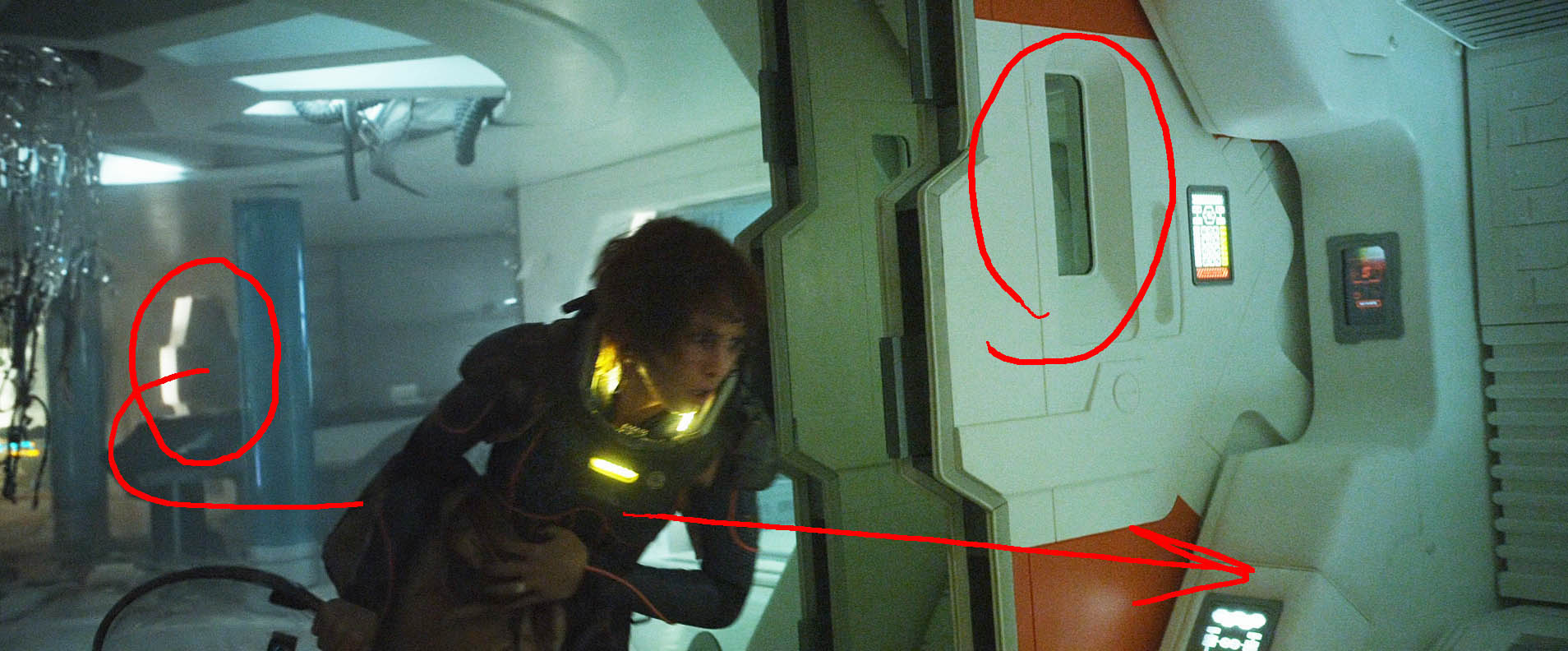 "So i think the only way she would be able to check out if the Trillobite or Engineer had left the room would be to enter the Lifeboat and peer through the 2nd Airlock Door which you circled above and i am not sure she would have a clear view of what lies behind the door area where the Corridor to the Med-Pod is."