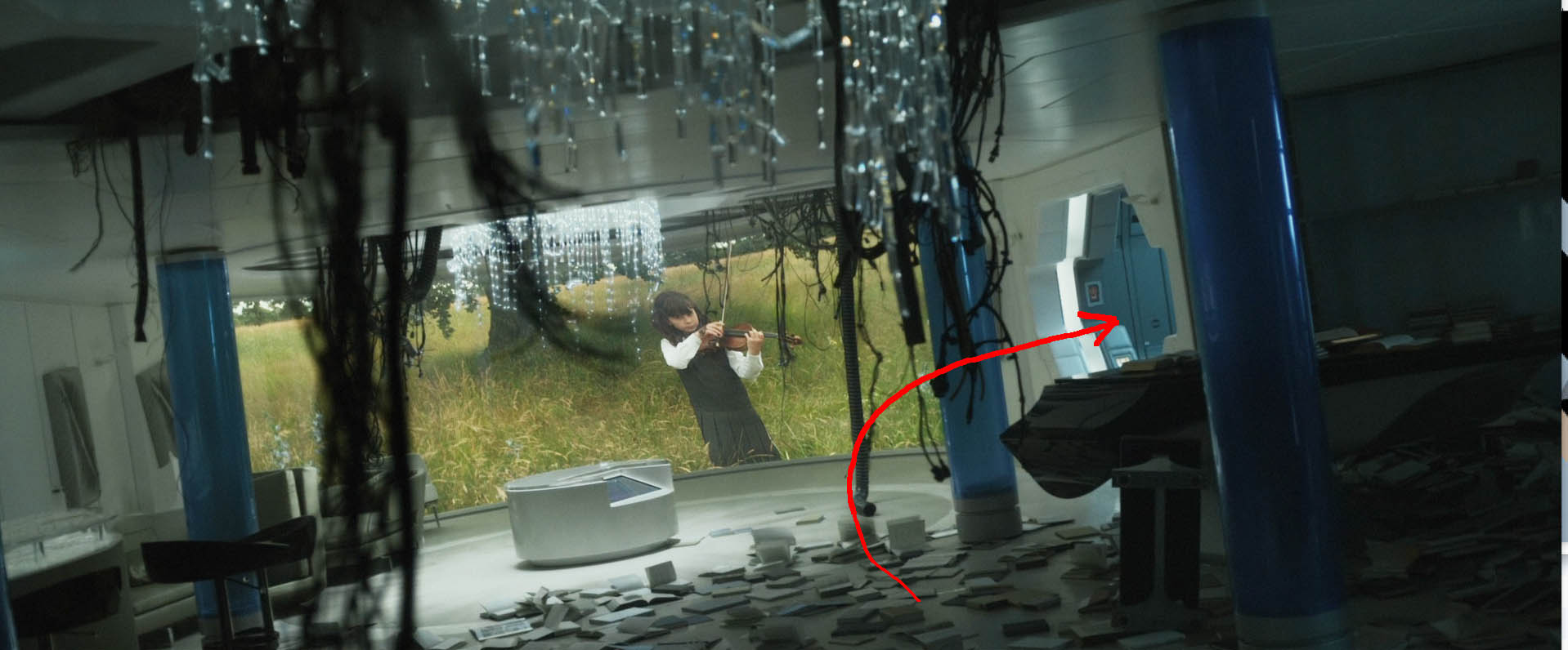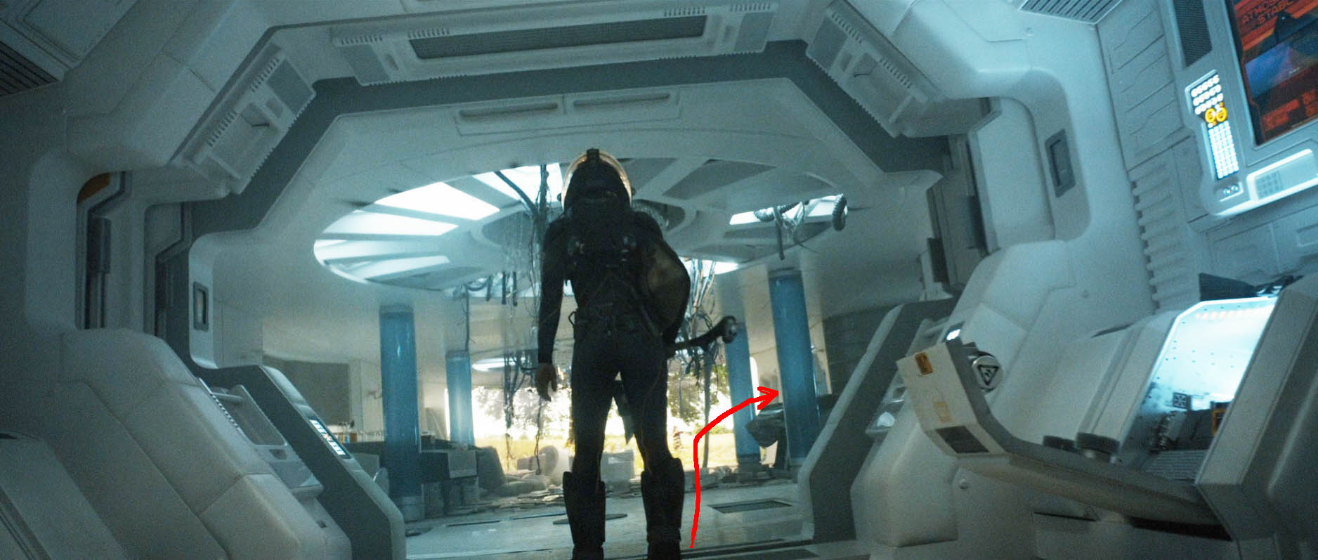 We then get  a Edit of the Full Version, as she places her Helmet on the Bar and then Proceeds to check out the sound she hears from the Trillobite, the Door she takes to the Corridor where the Med-Pod room is, is indeed open.
