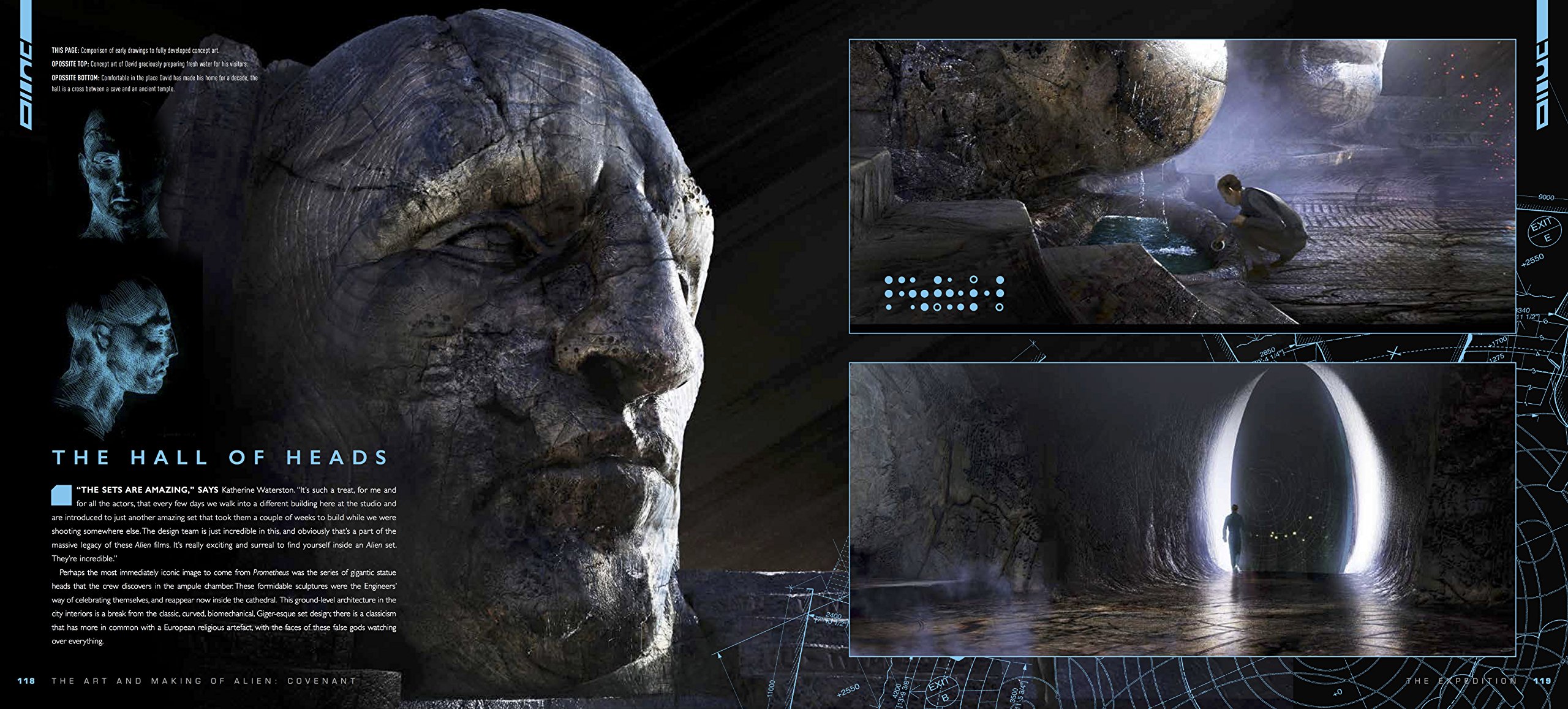 I think the interesting thing from the Art Book, which i have to purchase is this part, "This ground-level architecture in the city interiors is a break from the classic, curved, biomechanical, Giger-esque set design; there is a classicism that has more in common wit the European religious artefact, with the FACES OF THESE FALSE GODS watching over everything."