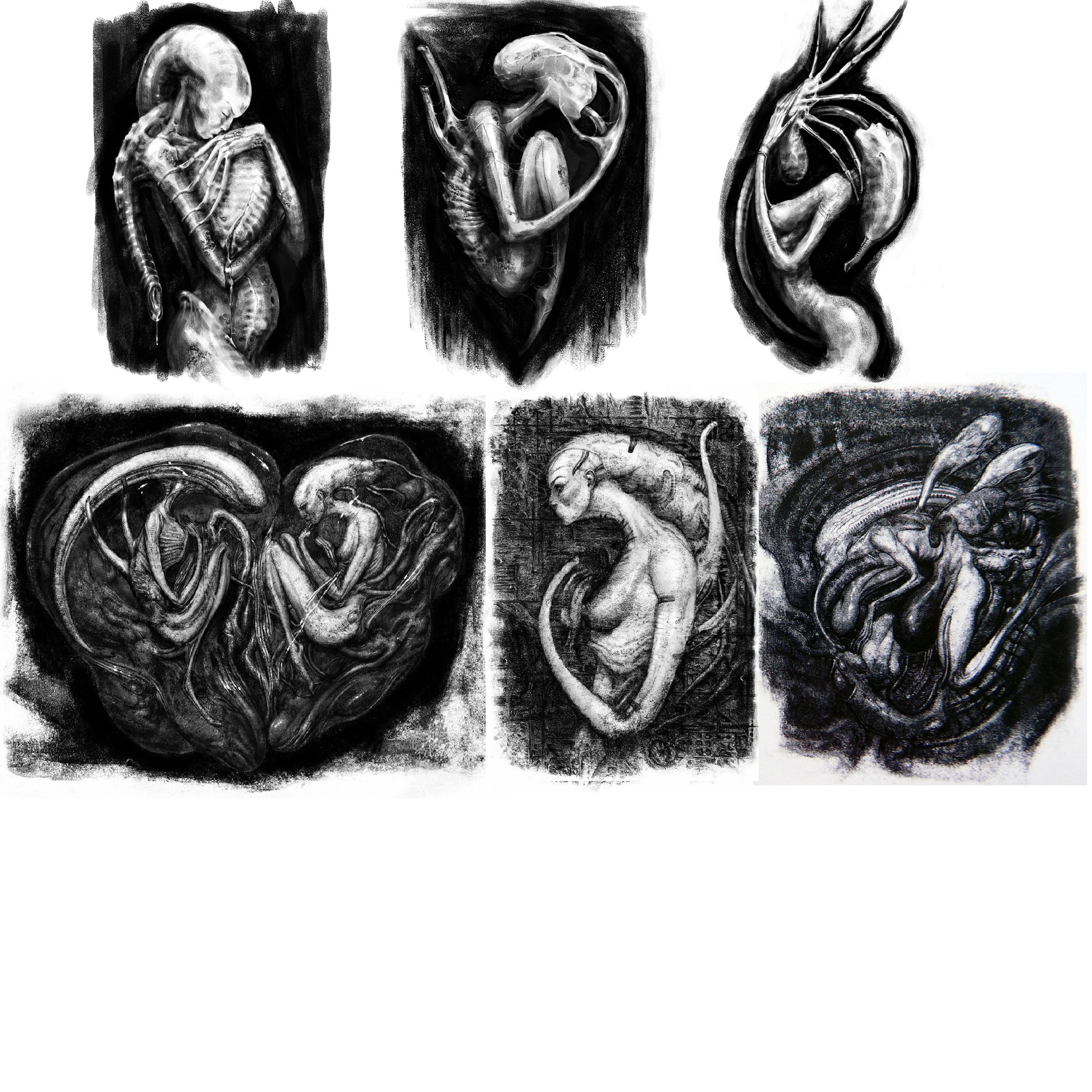 These concepts above, are pretty much similar to what the Source i had 2.5 years ago had described, and Chris can validate this as they did hint that Dr Shaw would become in effect Sin from the Paradise Lost Poem and one of the TWO Monster Designs would be based of one of the Original Xenomorph Designs, but wont be a Xenomorph and the other would be based off Necronom 4 but again wont be a Xenomorph and well the Necronom 4 was the Original idea, well HE Giger design they chose to follow and base the Original Alien off... so this rules out Necronom 4 for the other Monster, which brings me to the First Original Design Giger had done for the Monster in Alien.