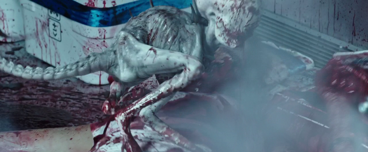 The route to create this Xenomorph Relative was Black Goo contaminating Dr Shaws Re-productive Organs, this would be via one of either.