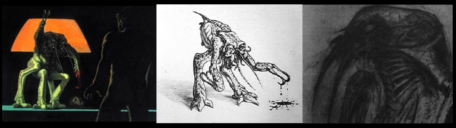 Concept Artist Ron Cobb designed the first two images above, and the one on the far right is a sketch that Dan O'Bannon did that looks a bit like the Fresco Creature from Prometheus to me anyway.
