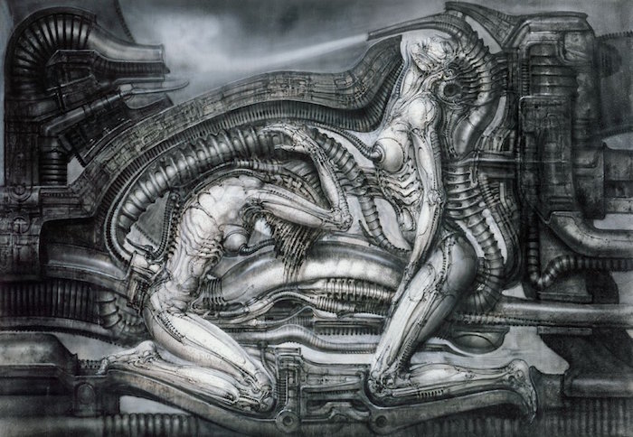 As all of you are very well aware of, Ridley Scott took use of the concept art created by the late H. R. Giger when he made Alien. Giger’s art form became known as biomechanical since its motifs blended biological (humans, limbs, organs etc) with mechanical (tubes, gears, apparatus etc). To the biological part, the sexual aspect also belongs which is explicit in his art (genitals etc).