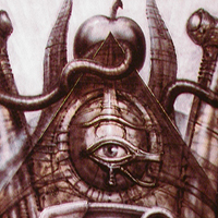 If we take a closer look at Giger’s Mural, the frame around the xenomorph life cycle is a woman bending over at the hips. The left frame is a leg and the right frame is an arm. The woman's face (lower part - jaw and mouth) can be seen in the upper right corner. In the middle is the womb giving birth to the xenomorph egg (with a facehugger inside). But, there is also a sperm swimming towards the womb (merged with the all seeing eye of God)?