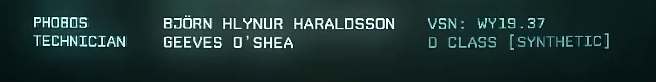 Second image: Ok, the female technician is an android as well, a D Class Synthetic. But look at the information after the name Phobos! We see: VSN: WY19.37. Obviously, Phobos is the name of the male voice from the video, but I think he is not an android. I believe that VSN means Virtual Synthetic Name, revealing that Phobos is an AI similarly to Mother from Alien or Father from Alien4. But what about 19.37?