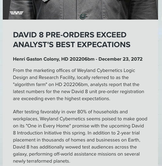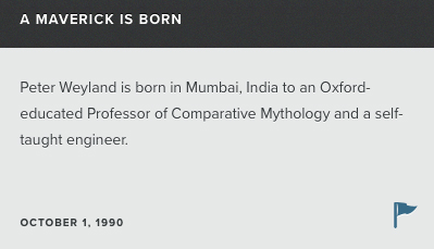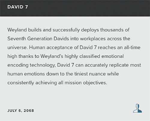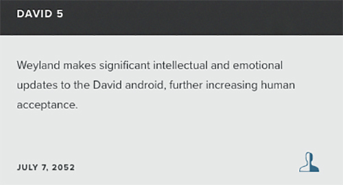 • Ridley guesses that Weyland was probably 100 years old in Prometheus. He looks to be in his 60s or 70s in Covenant, so that means he was probably created around 2050-2070. The timeline on the Weyland website would make it seem David 8 was created before David 7.