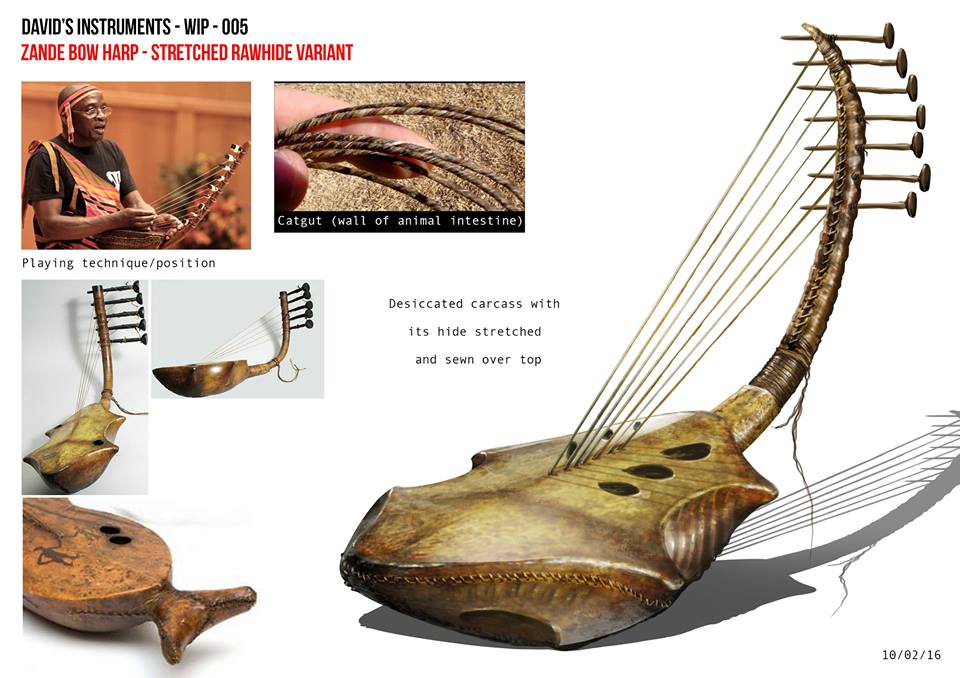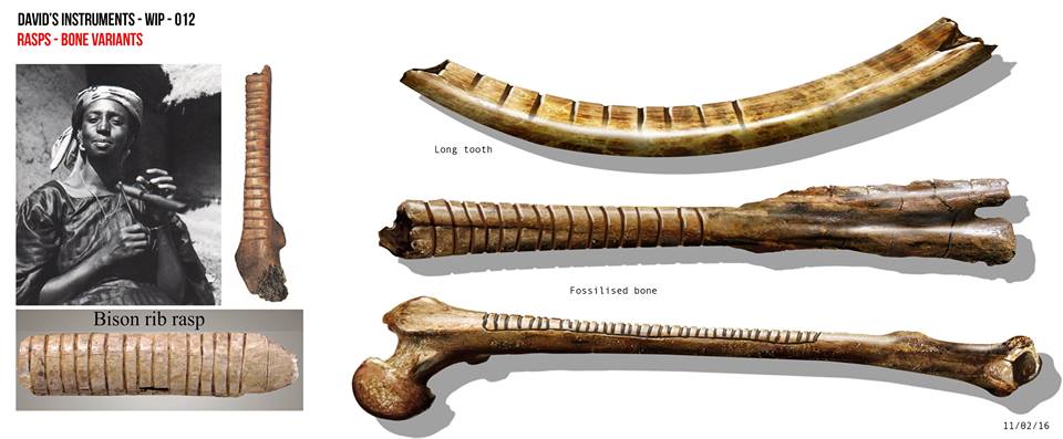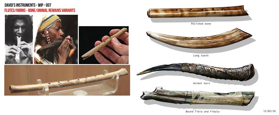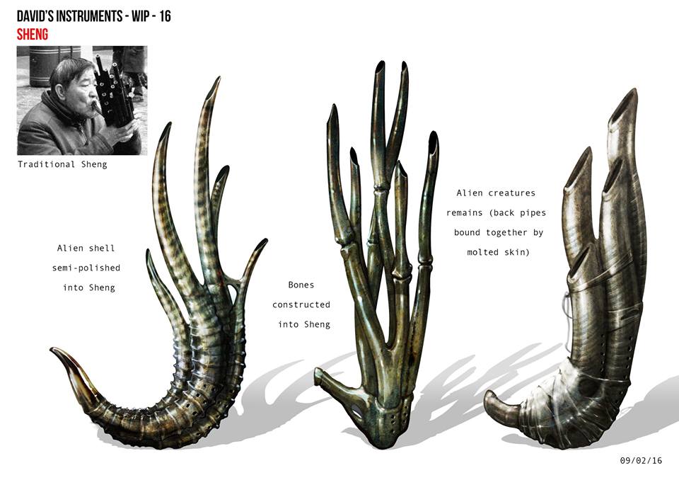 'At some point in the development of the story, Davids living quarters was to be filled with instruments crafted from locally sourced materials. I suppose it ultimaltey boiled down to the 'flute' scene, but during the concept phase Ridley and the designer were right into basing them on real ancient items (hence the cluttered reference on every page).'