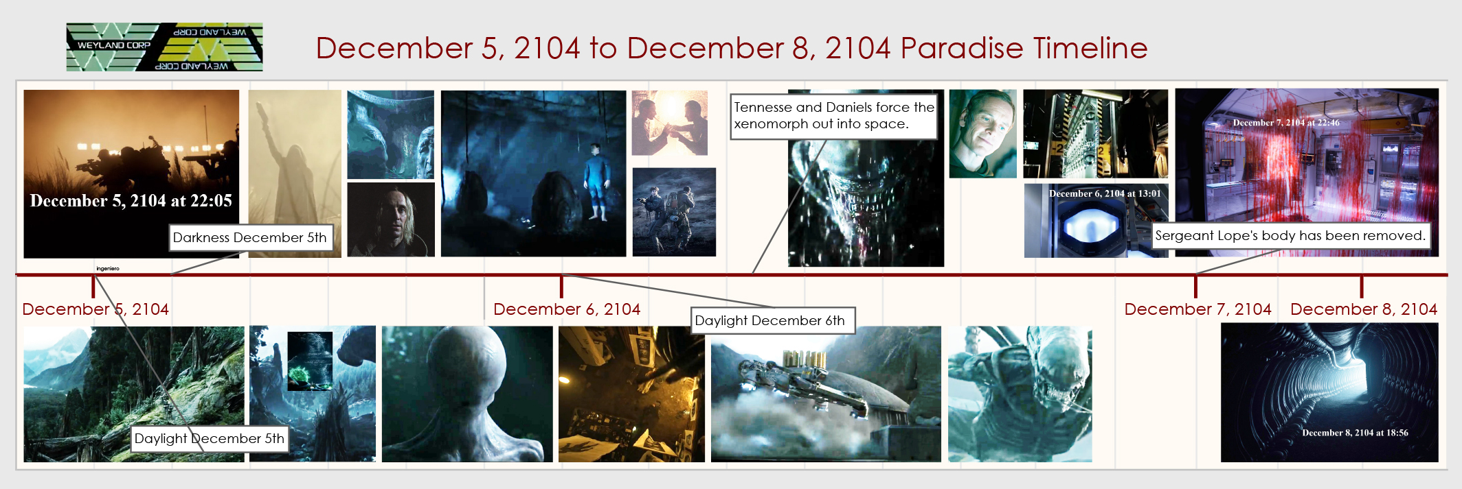 The above images were marketed with date/time stamps and then we had an idea of the timeline showing how long the Covenant crew was on Paradise. The last image has a date/time stamp for two days after David 8 put Daniels to bed. The medical bay where Lope died is shown without his body in it.