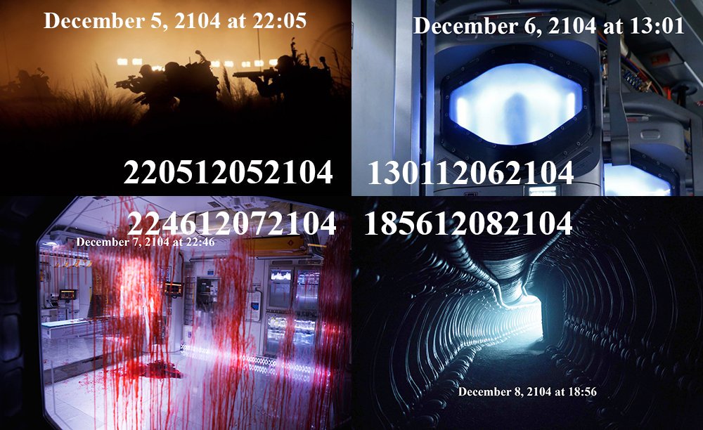 The below timeline is an attempt to reconcile the date/time stamps on the four above images with captures from Alien: Covenant.