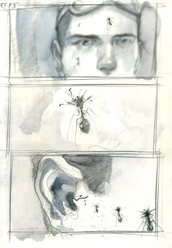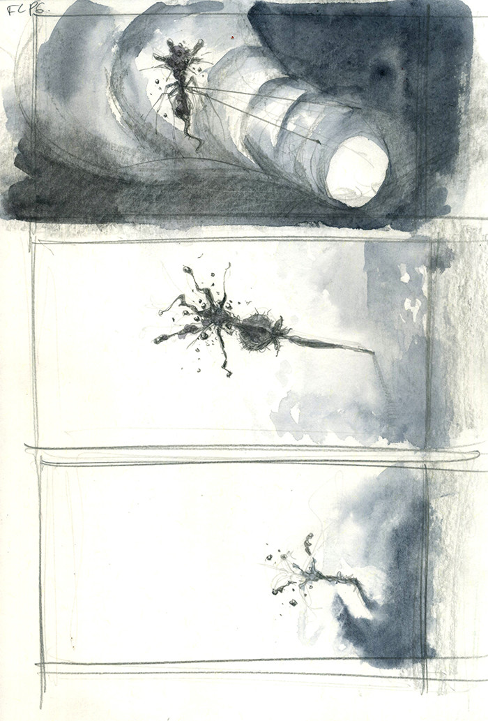 It is so very interesting to see what evolved into the movie from the story boards above. Small changes in concept make such a difference on screen. I do prefer the mote swarm used in the film opposed to an infected mosquito shown in concept.