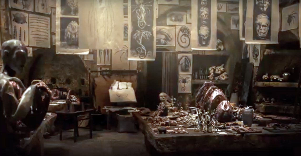 If David had access to (living) engineers, the result would probably have been even more hideous than the xeno-like creature erupting from Oram's (and Lopé's) ribcage, perhaps what we get a glimpse of in the mural . . .