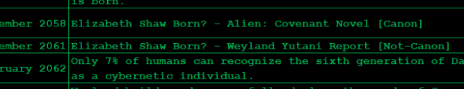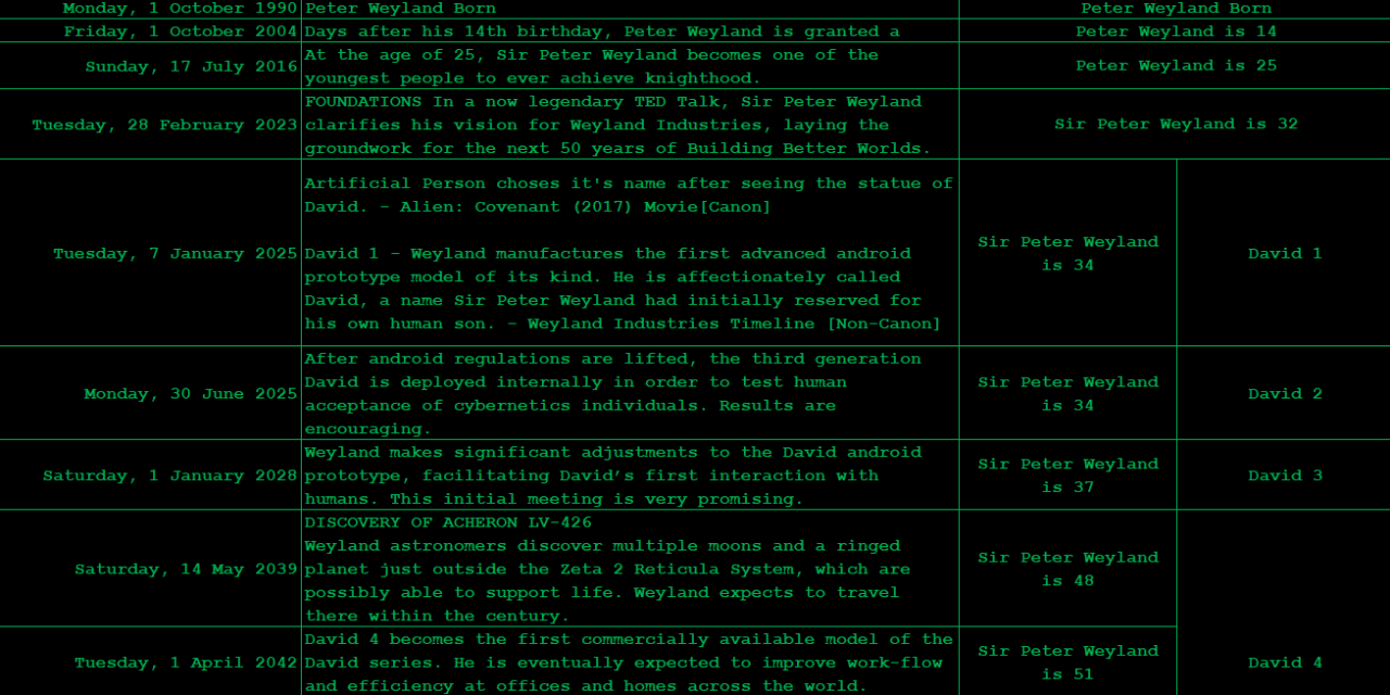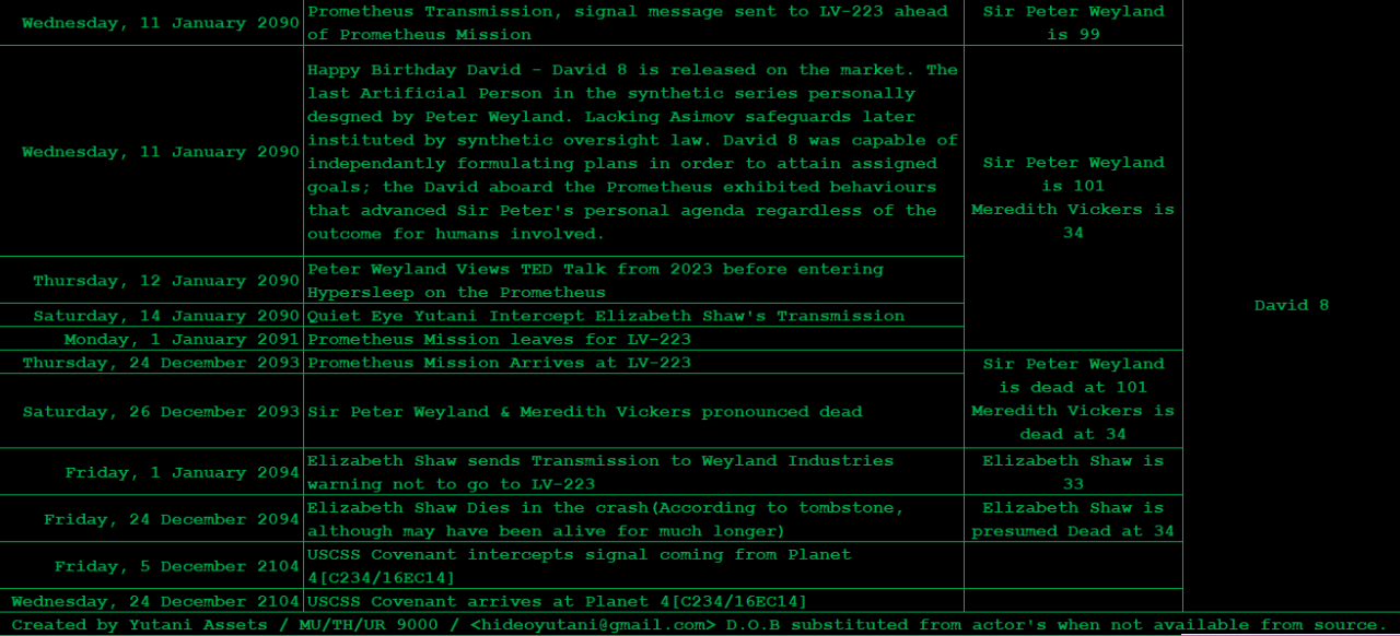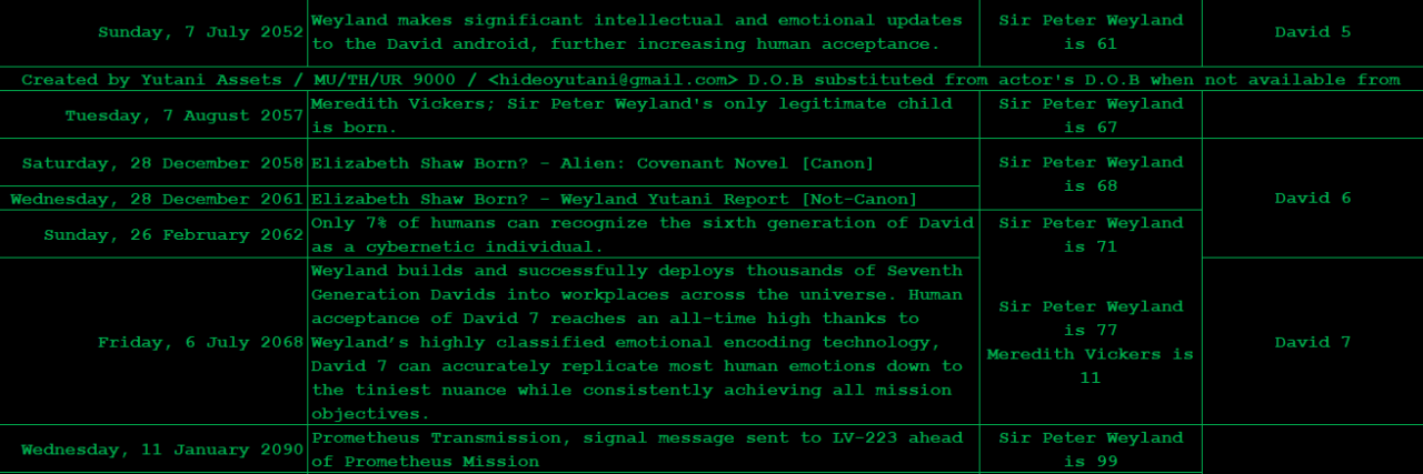 Sir Peter Weyland, Meredith Vickers and David 8 timeline leading up to USCSS Covenant.