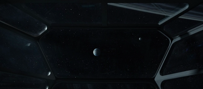 Prometheus, arrival scene, two 'big' moons in the distance, LV-223 and LV-426?, probably yes, we don't know, there is no ring, there is no the planet itself, their positions are unknown, the ring and the gas planet (Calpamos) are out of sight: