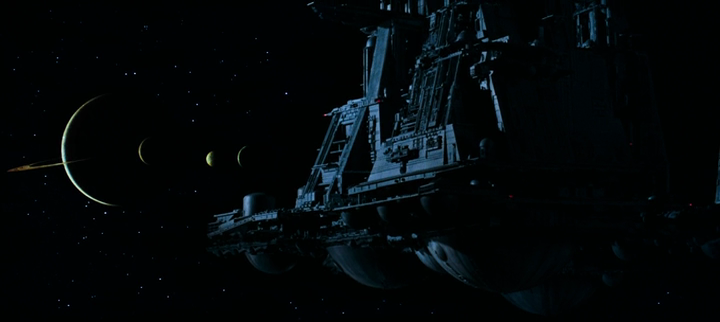 Movie image from Alien, the three (four?) relatively big planetoid moons are outside the ring, no doubt: